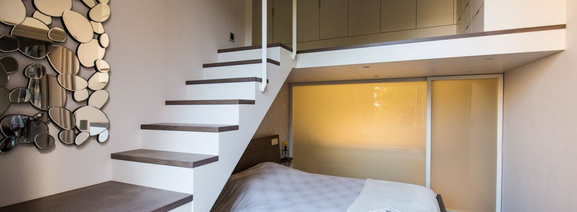 Dans un soucis de gain de place, la hauteur sous plafond de 4m de cette petite chambre a permis de positionner le dressing sur une mezzanine, et ainsi optimiser l’espace au maximum. La capacité de rangement a été augmenté en intégrant des tiroirs dans les marches d’escalier et dans le cadre de lit sur mesure. La conception de la chambre joue sur les contrastes entre le gris clair laqué et le chêne teinté gris. La tête de lit intègre des appliques modernes qui peuvent rentrer, sortir et s’incliner à volonté.